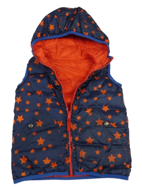 Tmavomodrá šušťáková zateplená obojstranná vesta s hviezdami a kapucňou