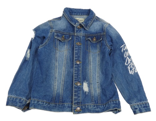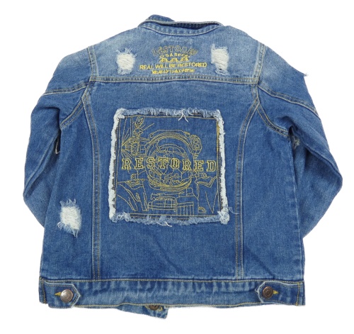 Modrá rifľová bunda s vyšúchaním a nápisem na rukávu