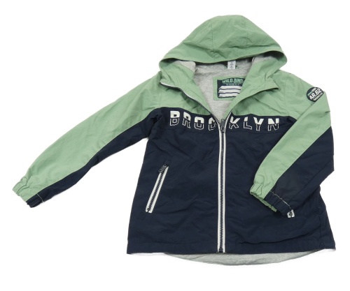 Zeleno-tmavomodrá šušťáková jarná bunda s nápismi a kapucňou Dopodopo