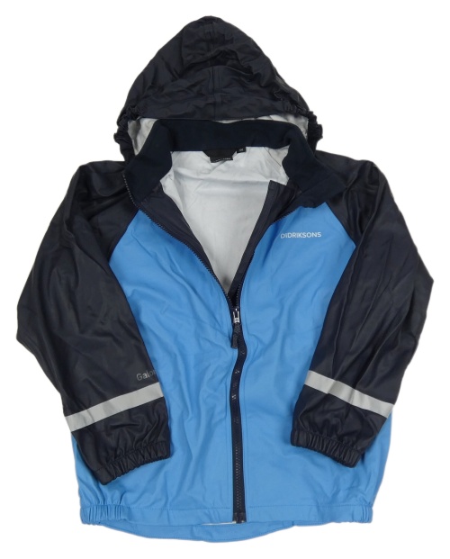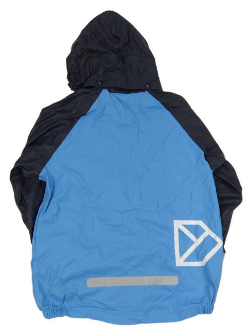 Modro-tmavomodrá nepromokavá bunda s nápisom a kapucňou