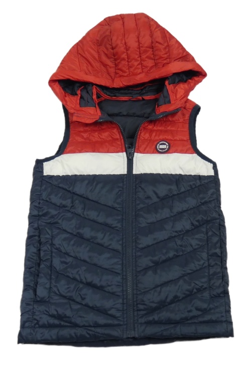 Tmavomodro-červeno-biela prešívaná šušťáková zateplená vesta s kapucňou Jack & Jones
