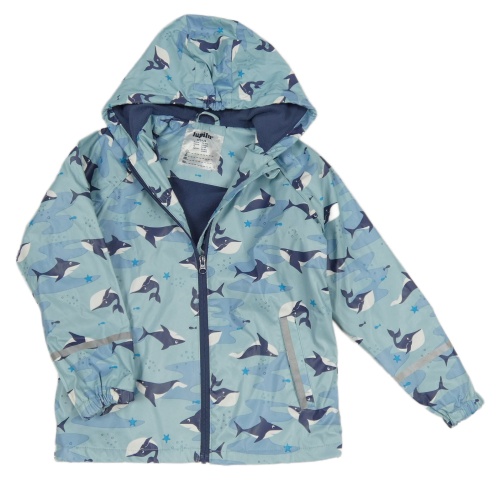 Svetlomodrá army nepromokavá jarná bunda s velrybami a žralokmi a kapucňou lupilu
