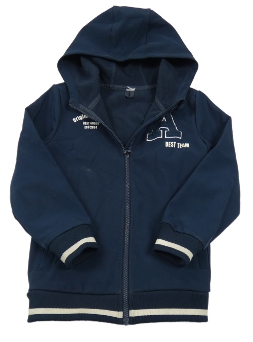 Tmavomodrý softshellový bombers s písmenkom a nápismi a kapucňou