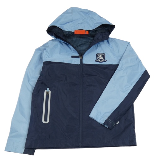 Světlemodro-tmavomodrá šušťáková jarná bunda s výšivkou a kapucňou