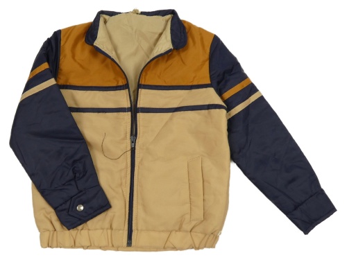 • Béžovo-medovo-tmavomodrá šušťáková zateplená bunda s pruhmi a ukrývací kapucňou