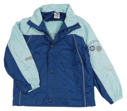 Tmavomodro-svetlomodrá šušťáková jarná bunda s potlačou a kapucňou Alive