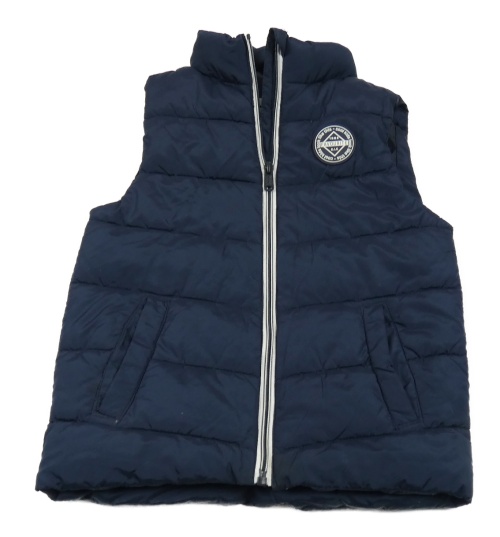 Tmavomodrá šušťáková zateplená vesta s nášivkou Dopodopo