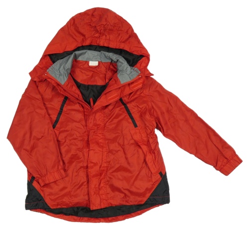 Červeno-čierna šušťáková jarná bunda s ukrývací kapucňou
