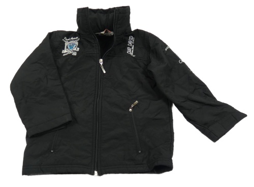 Čierna šušťáková jarná bunda s nápismi a ukrývací kapucňou Camp David