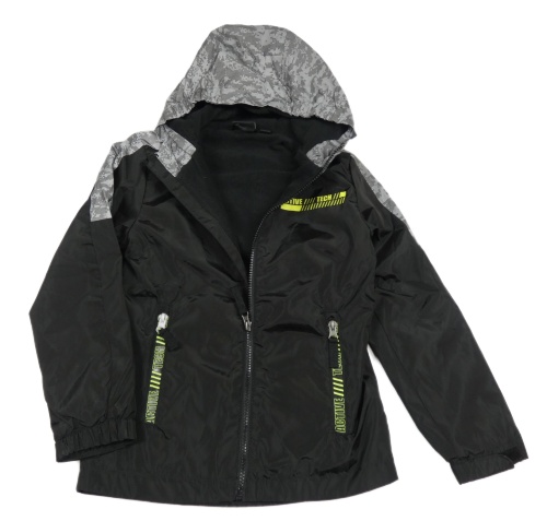 Čierno-sivá šušťáková reflexní jesenná bunda s nápisom a kapucňou