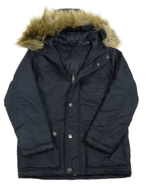Tmavomodrá šušťáková zateplená bunda s vreckami a kapucňou s kožešinou