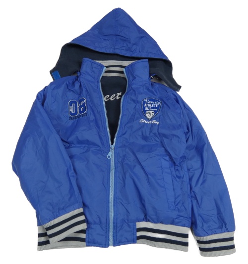 • Safírový šusťákový jarní oboustranný bomber s číslom a nášivkou a pruhmi a odopínacíá kapucňou