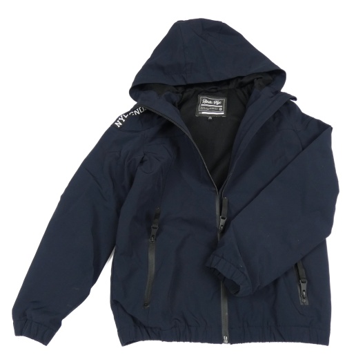 Tmavomodrá šušťáková jarná bunda s nápismi a kapucňou