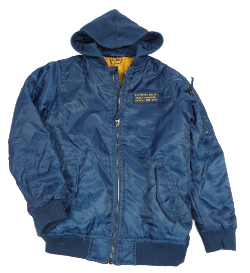 Tmavomodrá šušťáková zimná bunda s nášivkou a kapucňou