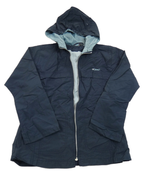 Tmavomodrá šušťáková jarná bunda s nápisom a kapucňou