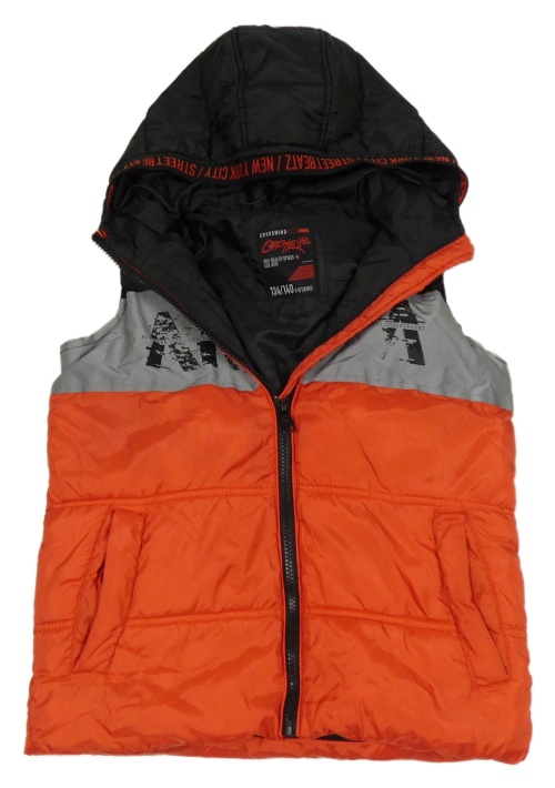 Čierno-sivo-červená šušťáková zateplená vesta s potlačou a kapucňou