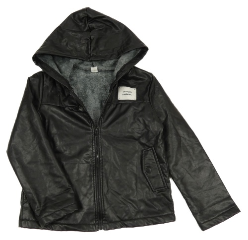 Čierna koženková zateplená bunda s nášivkou a kapucňou SHEIN