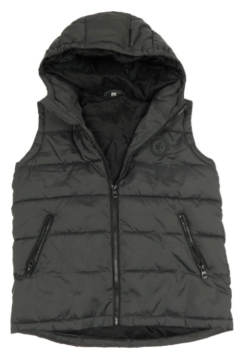 Tmavosivá šušťáková prešívaná zateplená vesta s kapucňou