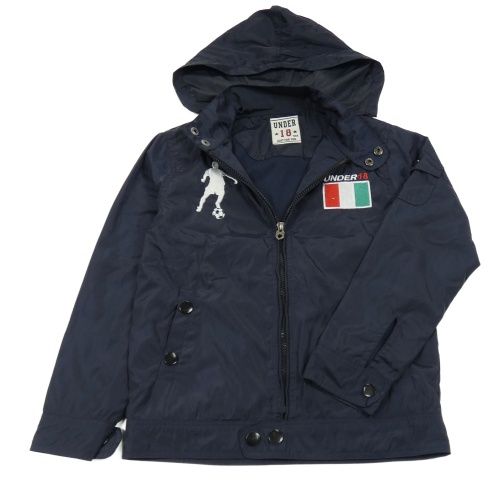 Tmavomodrá šušťáková jarná bunda s vlajkou a kapucňou