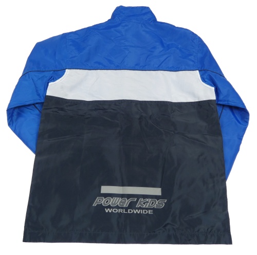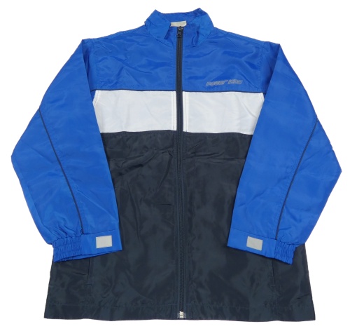 Modro-bielo-tmavomodrá šušťáková jarná bunda s nápisom