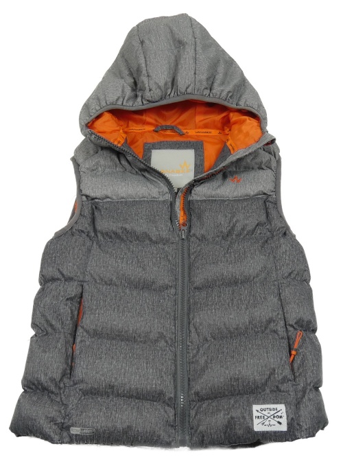 • Tmavošedo-sivá melírovaná prešívaná šušťáková zateplená vesta s nášivkou a kapucňou WANABEE