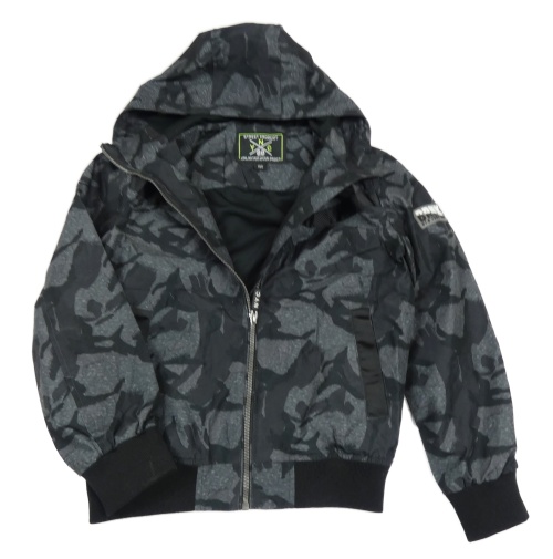 Tmavošedo-černý army šusťákový jarní bomber s nášivkou a kapucňou C&A