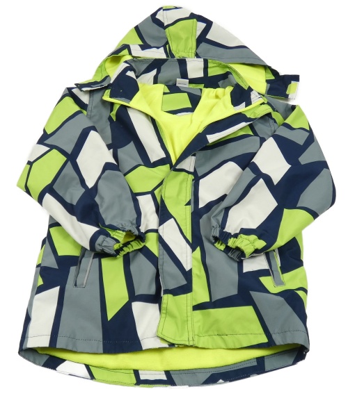 Tmavomodro-sivo-limetková vzorovaná šušťáková zateplená bunda s kapucňou