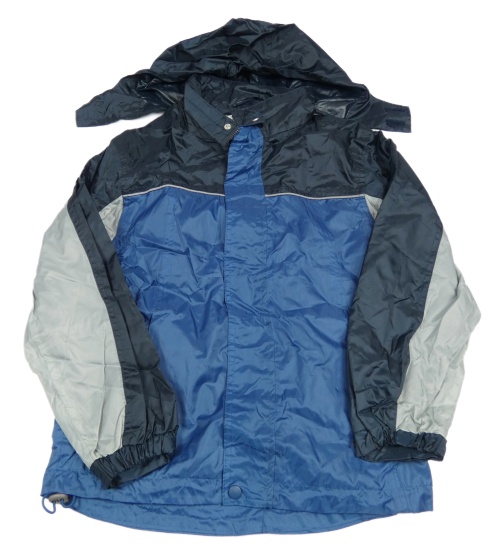 Modro-tmavomodro-sivá šušťáková jarná bunda s ukrývací kapucňou