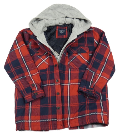 Červeno-tmavomodrá kockovaná zateplená košeľová bunda s teplákovou kapucňou Next