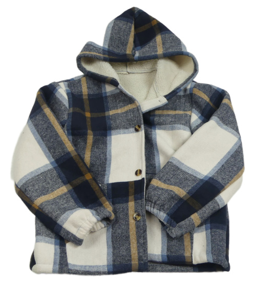 Tmavomodro-bielo-hnedá kockovaná zateplená košeľová bunda s kapucňou