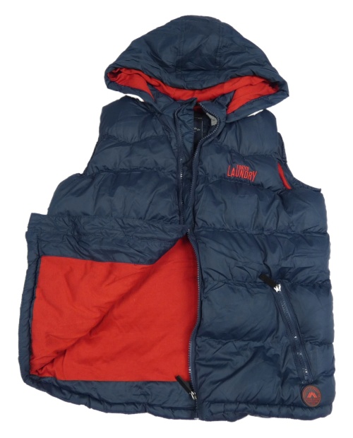 Tmavomodrá šušťáková zateplená vesta s nápisom a kapucňou Tokyo Laundry