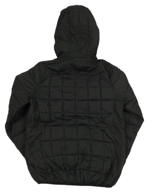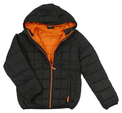 Čierno-oranžová šušťáková prešívaná zateplená bunda s kapucňou