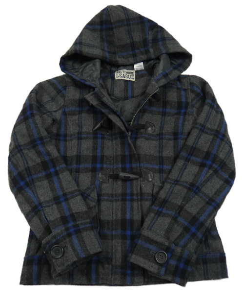 Sivo-čierno-modrá kockovaná vlnená zateplená bunda s kapucňou