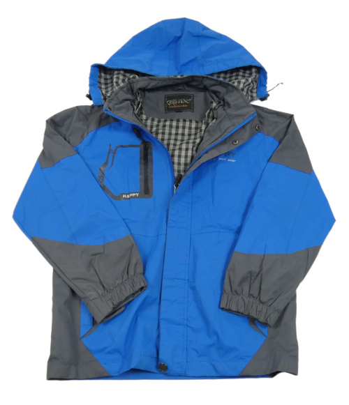 • Cobaltovoě modro-tmavosivá šušťáková jarná bunda s nápismi a odopínacíá kapucňou
