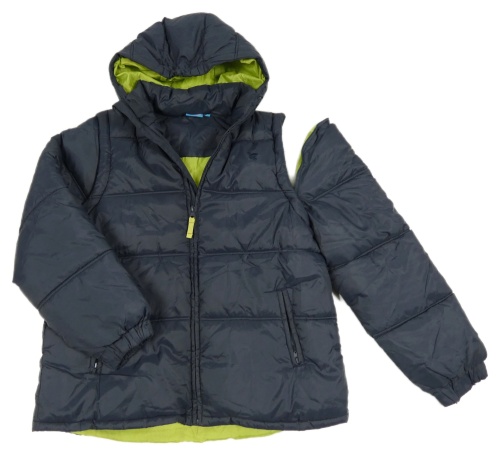 • Tmavomodrá prešívaná šušťáková zimná bunda s odepínacími rukávy a kapucňou muddy puddles
