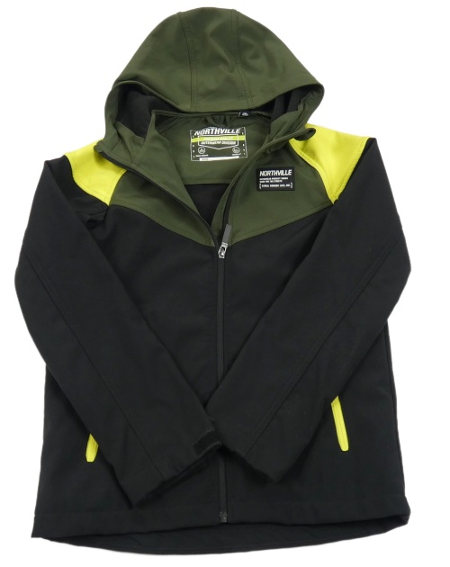 Kaki-čierno-žltá softshellová bunda s nášivkou a kapucňou C&A