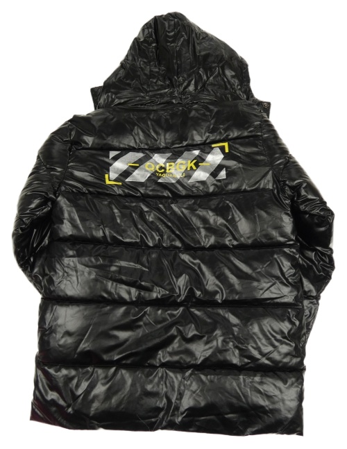 Čierna koženková zimná bunda s nápisom a kapucňou