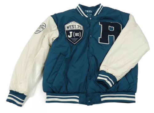 • Petrolejovo-smetanový šusťákový zimní baseballový bomber s písmenkom a nášivkami a pruhmi ZARA