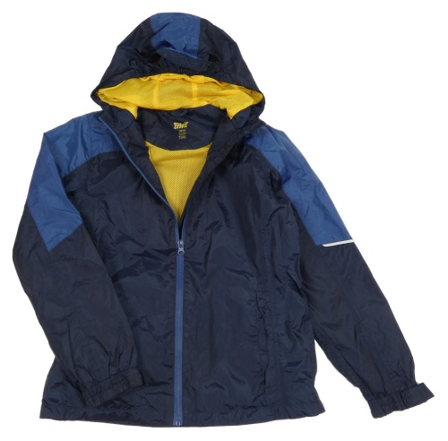 • Tmavomodro-modrá šušťáková nepromokavá funkčná jarná bunda s kapucí + sáček crivit