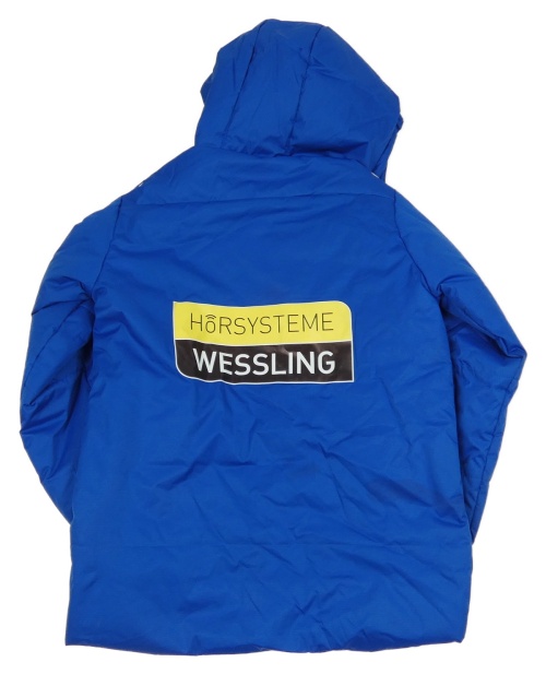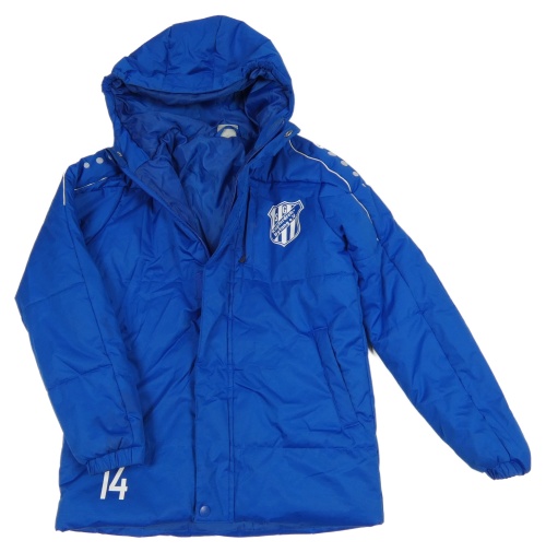 Modrá šušťáková zimná bunda s potlačou a kapucňou Jako