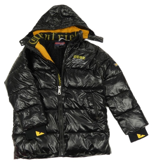 Čierna koženková zimná bunda s nápisom a kapucňou