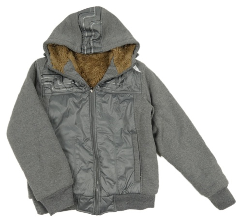 Sivá šušťáková zateplená bunda s teplákovymi rukávy a a potlačou a kapucňou