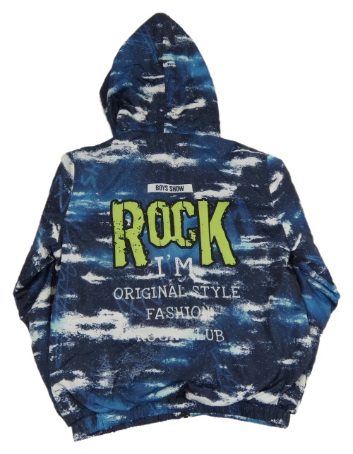 Tmavomodrá vzorovaná šušťáková zateplená bunda s nápisom a kapucňou