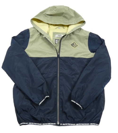 Tmavomodro-zelenošedá šušťáková jarná bunda s nášivkou a kapucňou BPC