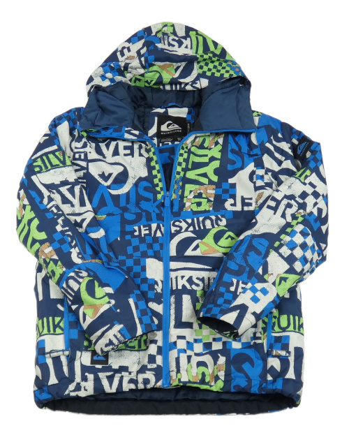Tmavomdoro-bielo-zelená vzorovaná šušťáková lyžiarska bunda s nápismi a kapucňou Quiksilver