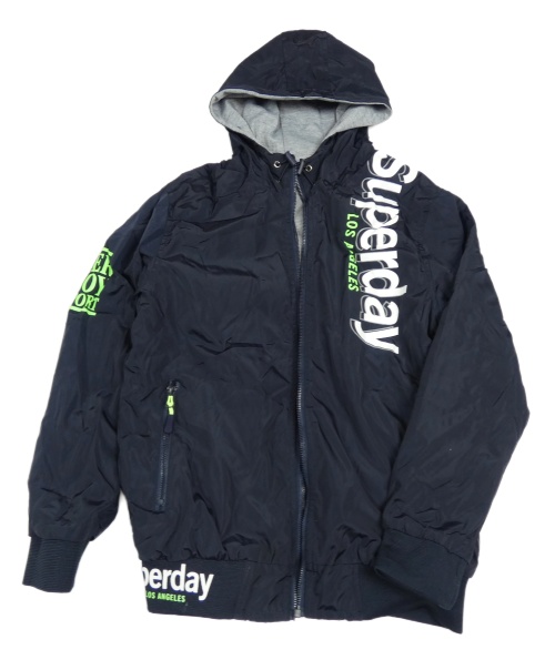 Tmavomodrý šusťákový jarní oboustranný bomber s nápismi a kapucňou