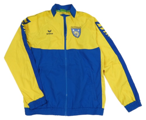 Tmavožluto-zafírová šušťáková funkčná futbalová bunda so znakom erima