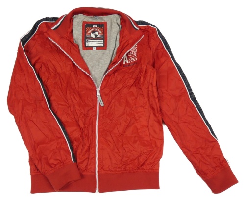 Červená šušťáková jarná bunda s nápisom we