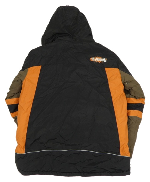Černo-oranžovo-khaki šušťáková zimná bunda s nášivkou a kapucňou