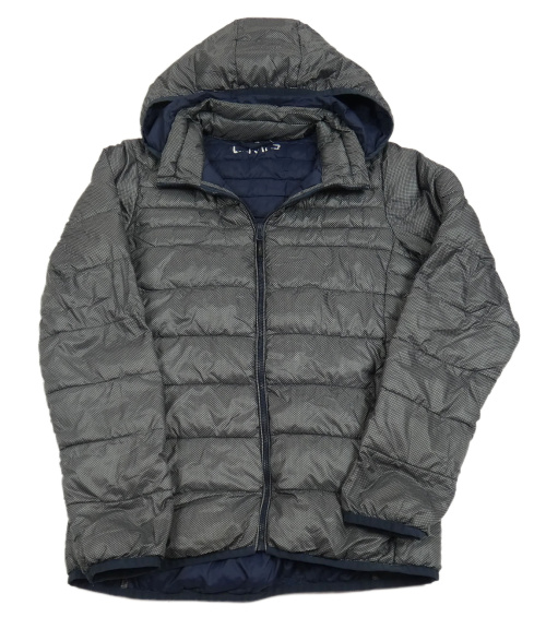• Sivo-tmavomodrá vzorovaná prešívaná šušťáková zateplená bunda s odopínacíá kapucňou